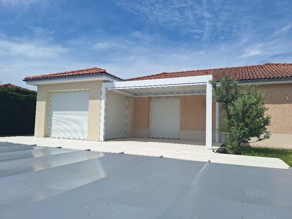 Pose d'une Pergolas Bioclimatique par les techniciens de SYSTEME BAIE Orcet. Gros avantage de cette pergola, c'est la toiture rétractable pour un maximum d'ensoleillement et de luminosité. Installation à Saint-Beauzire