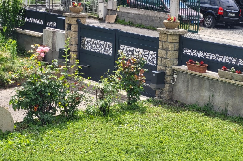 Fourniture et pose par les équipes de SYSTEME BAIE, votre menuisier à Cébazat, d'un portail alu avec motif à découpe laser, motorisé avec nos moteur DEA, et palissade assortie avec découpe boite aux lettres. Installation à Cébazat
