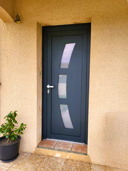 Installation d'une Porte d'entrée aluminium et volets roulants solaires (habillage des cintres) à Chappes. Une réalisation Système Baie.