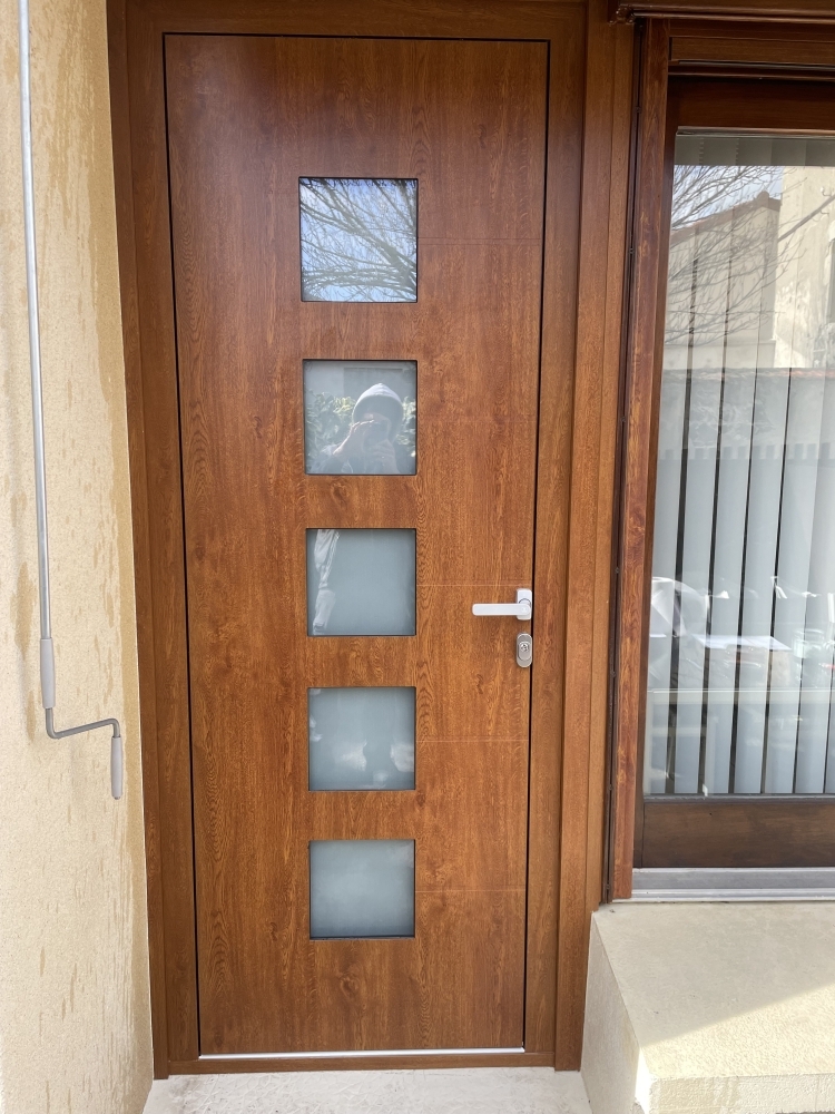 Installation d'une porte d'entrée Aluminium coloris Chêne Doré par les techniciens de Système Baie, votre menuisier à Pérignat sur Allier. Isolation ultra performante grâce à sont épaisseur d'ouvrant de 82 mm