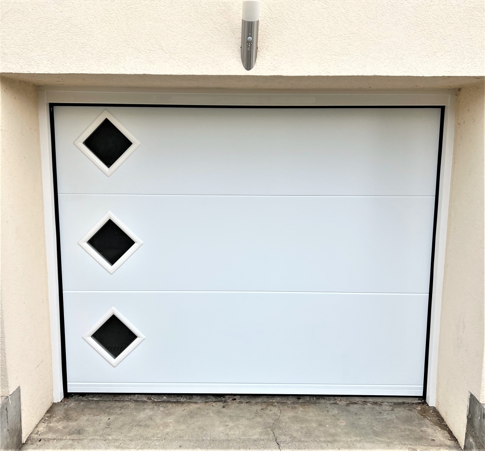Installation d'une Porte de Garage Sectionnelle motorisée par l'entreprise SYSTEME BAIE à Vertaizon. Option, Hublots losange avec double vitrage sablé, pour plus de luminosité.